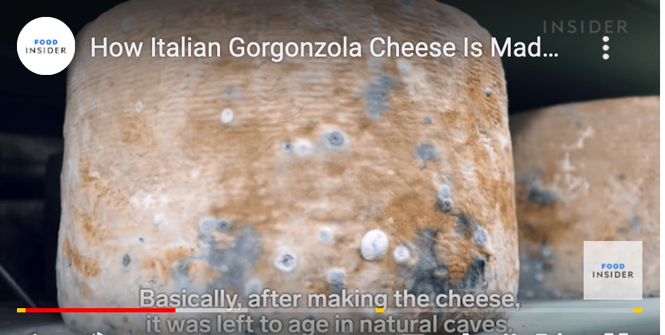 At 3:32 they talk about penicillium roqueforti, the blue mold, being added to the milk along with the other starter cultures. P. roqueforti is the most common strain used in blue cheeses, but its cousin P. glaucum is used in some blues instead such as Bleu d’Auvergne and, in fact, some gorgonzolas. Glaucum is more of a grey-blue and has a slightly milder flavor than roqueforti.